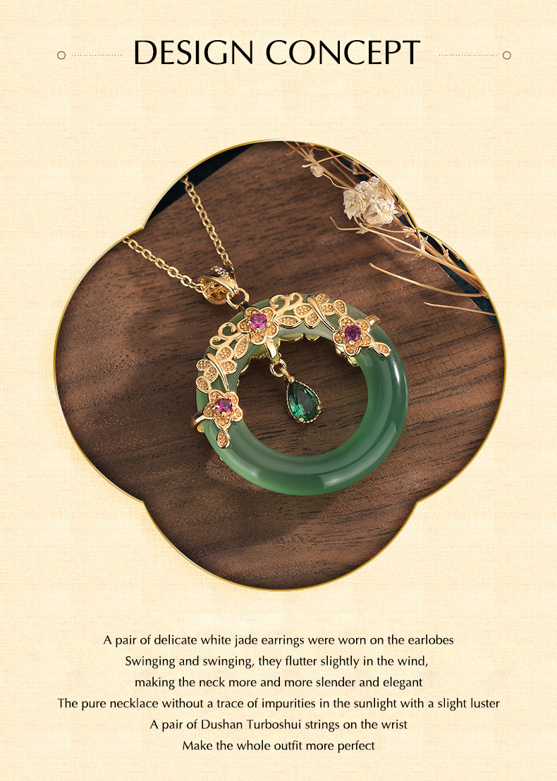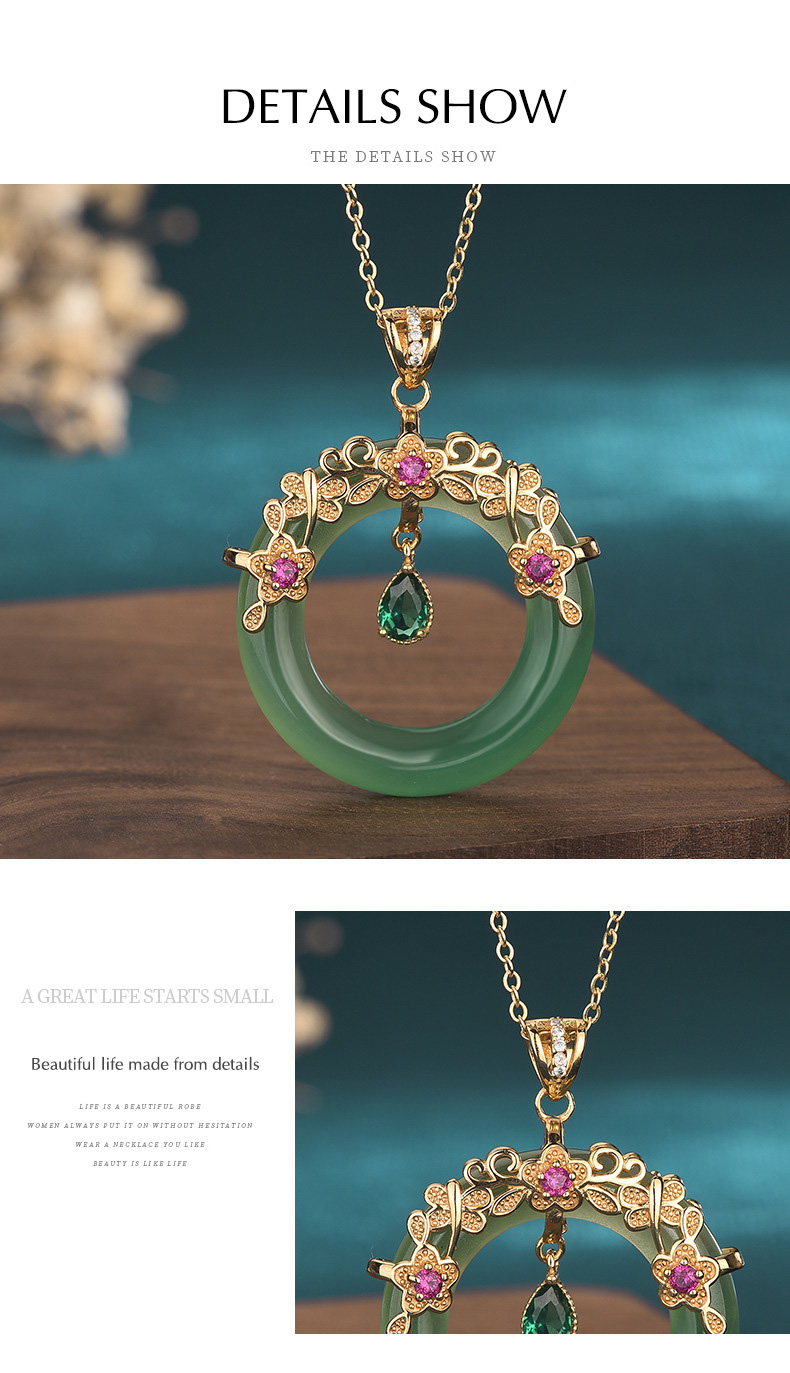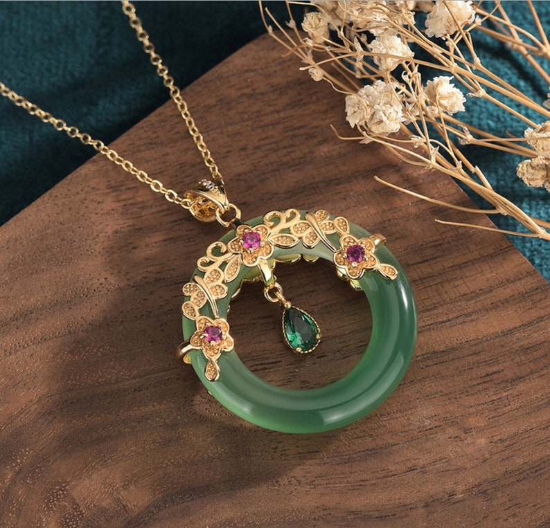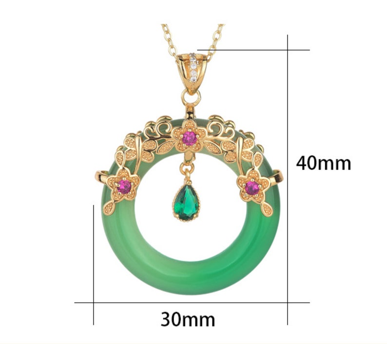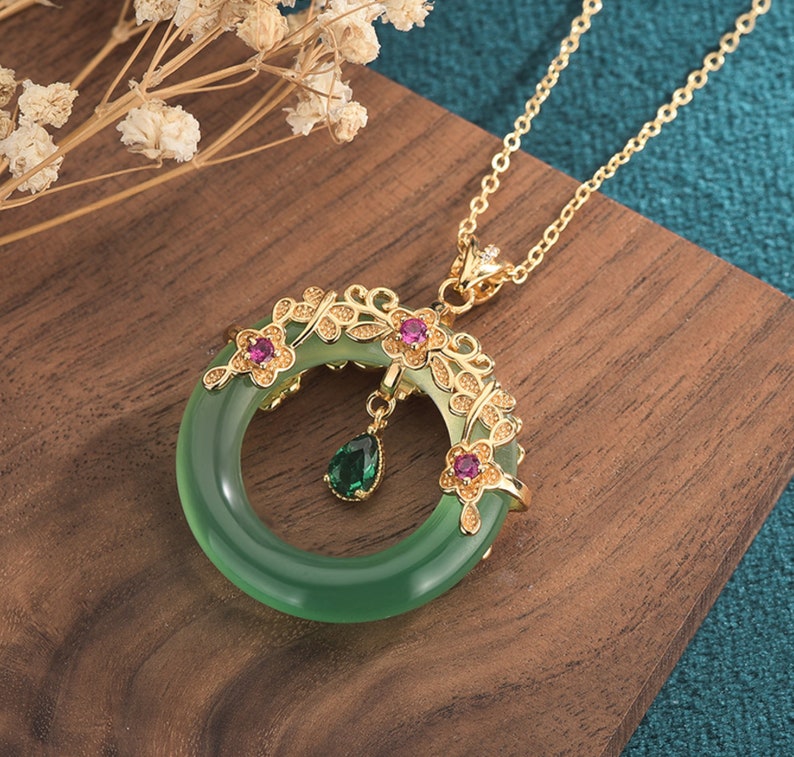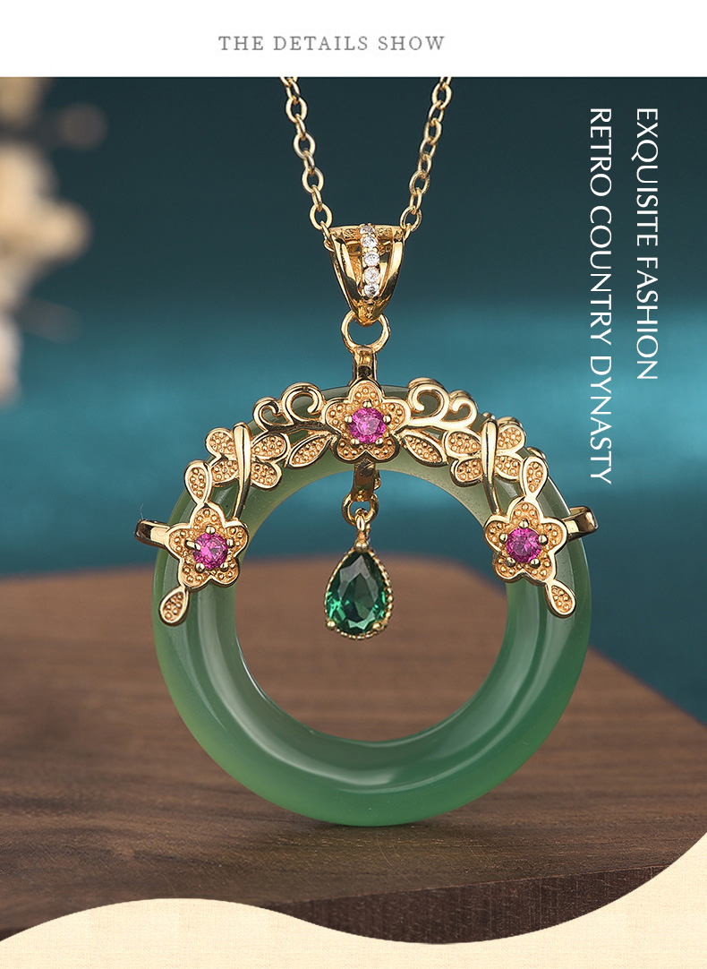 Jade Jewelry Lucky Ring Shape Charm Pendant with Chain Necklace 18K Gold Plated